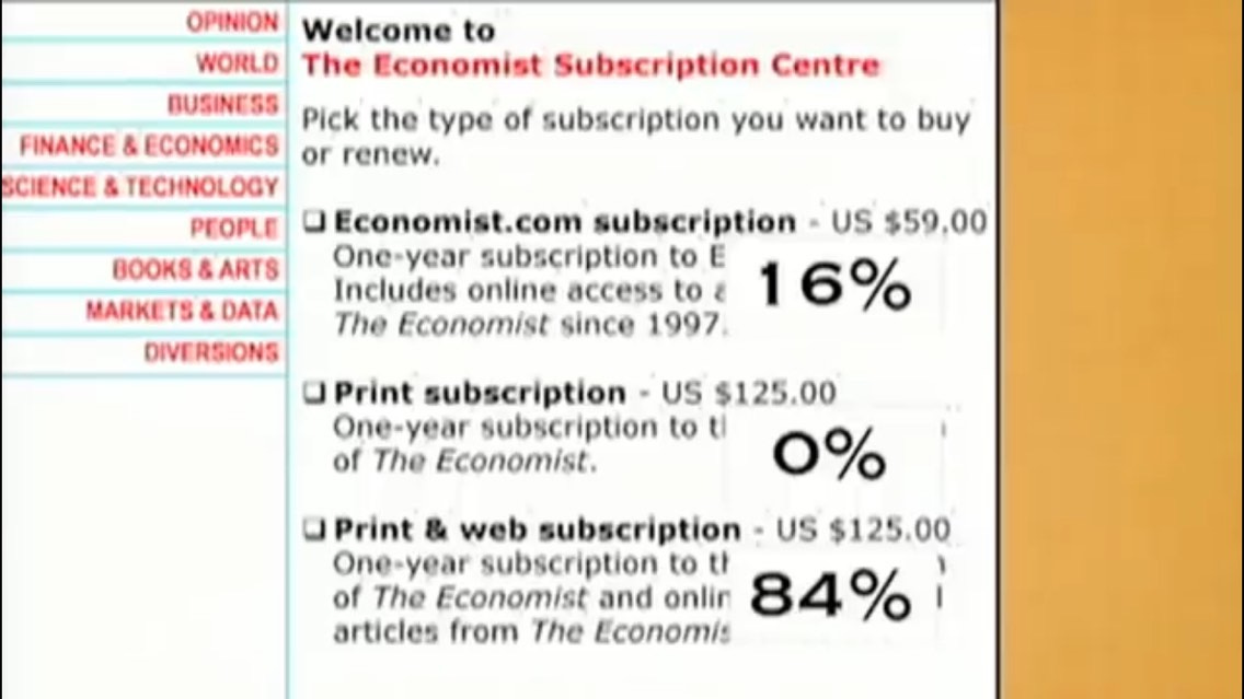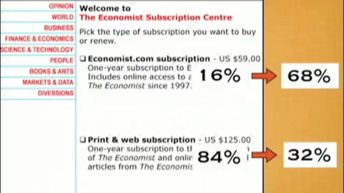 In the above ad from the 2000s, 3 newsletter subscription plans were offered. Out of 100 people, 84% chose the 3rd option for US$125. When the 2nd option was taken out, the majority chose the 1st plan for $59. Relative to the $125 print only plan, the print & web plan for $125 seemed like a great deal, hence 84% chose it over the cheaper $59 plan. Conclusion: we do not know our preferences that well, and therefore we are susceptible to external influences.